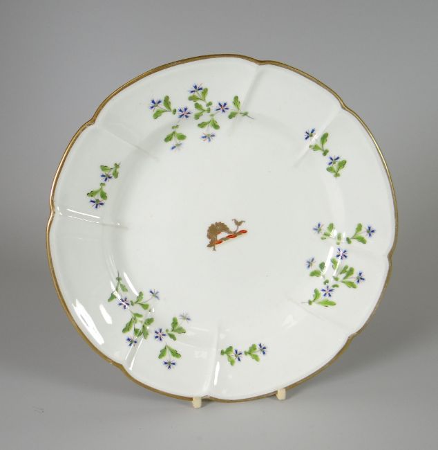 A SWANSEA PORCELAIN DISH of lobed form and decorated with cornflower sprigs and centred armorial crest in the form of a gilded sea-serpent, within a gilded rim, impressed SWANSEA mark to base, 22cms diam