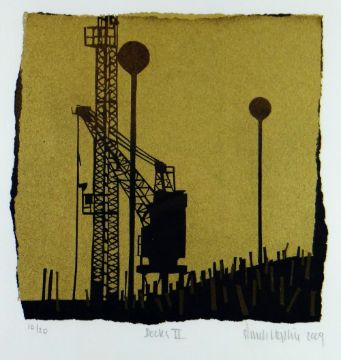 SARA HOPKINS limited edition (10/20) gold leaf screen print - silhouetted crane, entitled 'Docks II', signed and dated 2009, 38 x 28cms (framed and glazed)