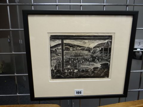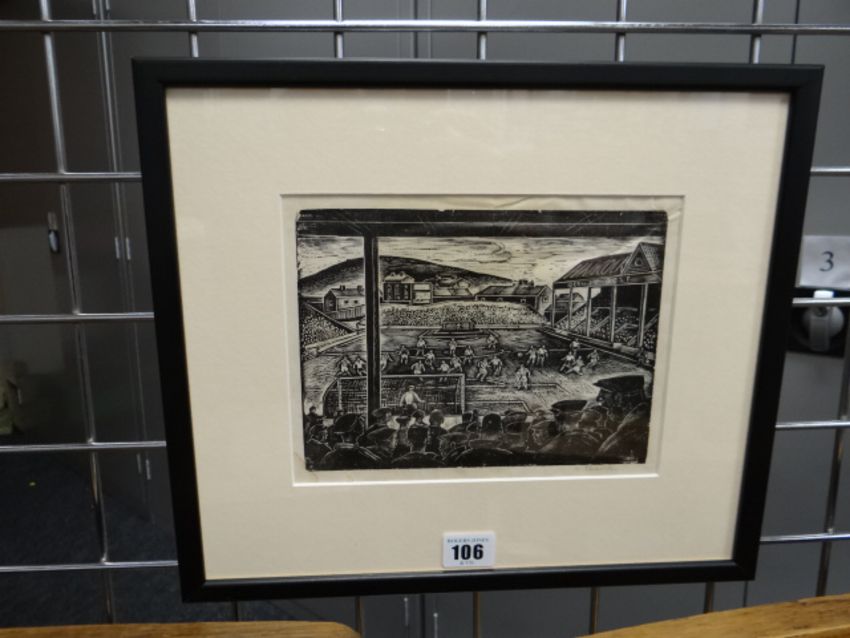 ARTHUR CHARLTON (1917-2007) wood engraving - a football match at the Vetch Field, Swansea with multiple men in the crowd, signed, 16 x 21cms (framed and glazed) Auctioneer's Note: please see lot 105There is some slight water damage in the bottom left corner and there is also some foxing