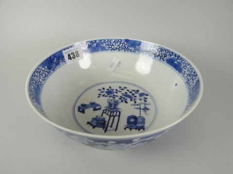 A nineteenth century Chinese porcelain footed circular bowl, the exterior decorated with Prunus, the interior with domestic wares and plants, having a floral and foliate border, four character marks to base, 20cms diam