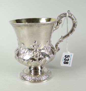An early Victorian repousse work footed mug with scrolling loop handle and with silver gilt interior, later inscribed, hallmarks for London 1840, 6.3ozs