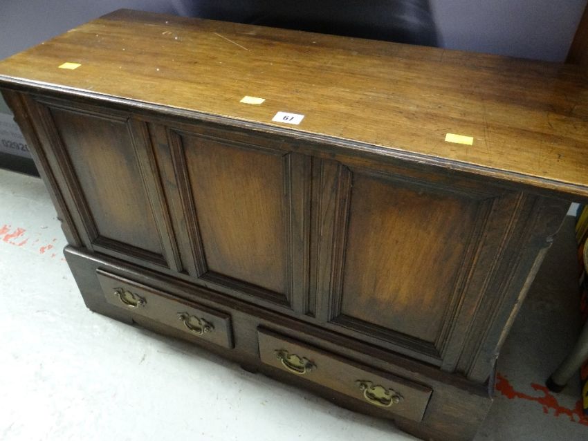 A small antique-reproduction coffer-bach having a hinged lid with two drawers in the base, 53cms h x 80cms l x 33cms d