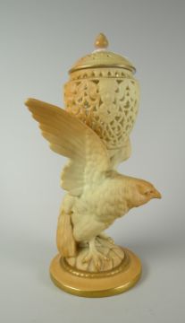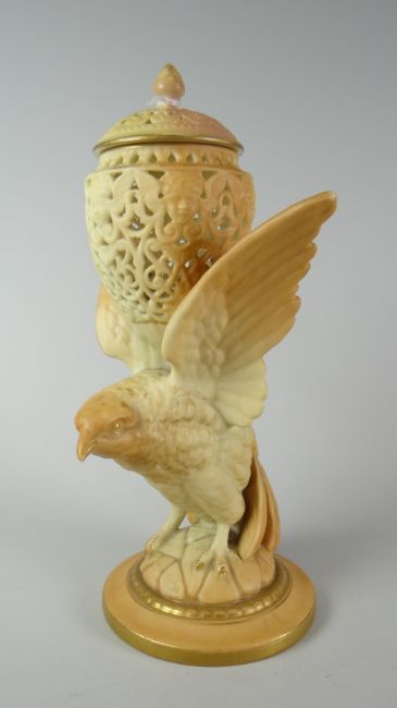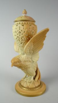 A Royal Worcester blush ivory and gilt eagle pot pourri with reticulated bowl and cover, 22cms high, model G11