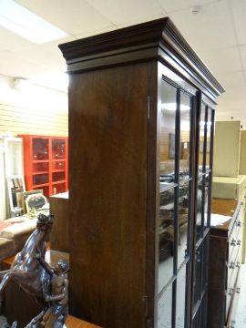 A good standing mahogany two-door glazed bookcase, 191cms h x 92cms l x 34cms d Condition reports provided on request by email for this auction otherwise items purchased `as seen` There are light surface scratches all over and a few of the shelves show signs of wear. There is no major damage, it feels structurally sound, the lock works well, there is a key. the shelves are adjustable