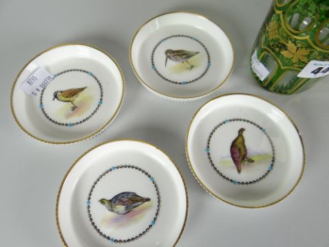 A pair of good antique oil bottles of fluted form and with tinted green glass and gilt vine decoration; together with set of four Royal Worcester porcelain coasters, hand painted with ornithological-specimens