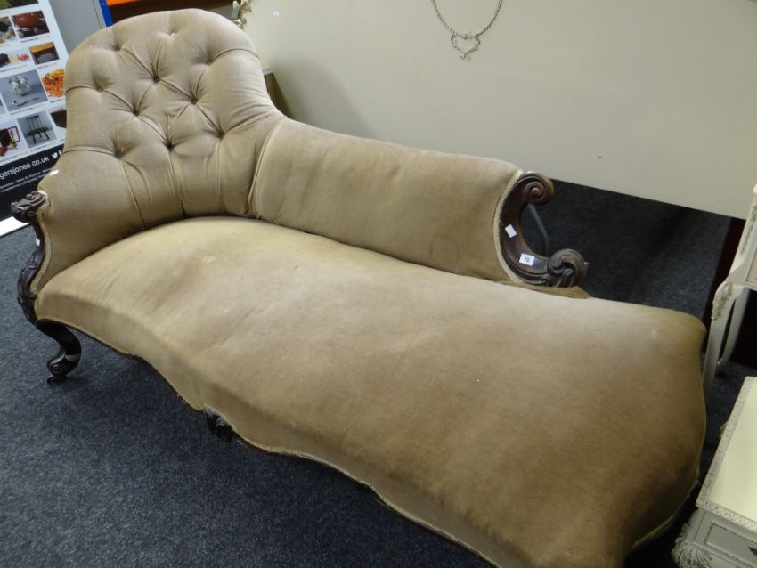 A Victorian buttoned back chaise-longue on curved and carved supports