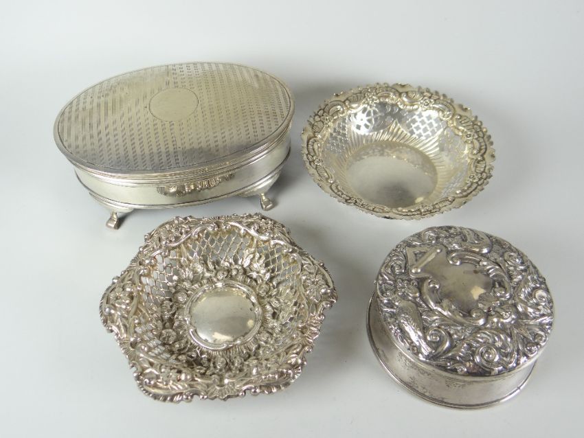 Four silver items comprising two pierced dishes, a circular silver ring-box and a footed oval jewellery box