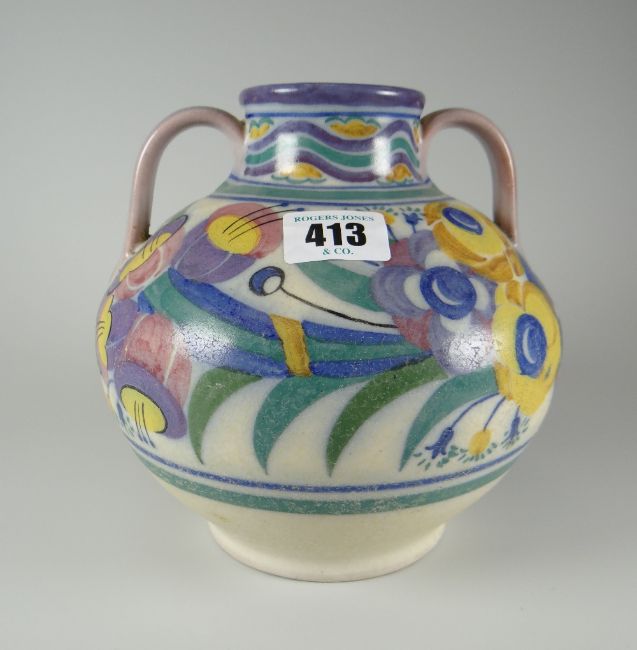 A good Poole pottery twin-handled vase, Carter Stabler Adams period and decorated with colourful flowers & leaves, monogrammed, 21cms high