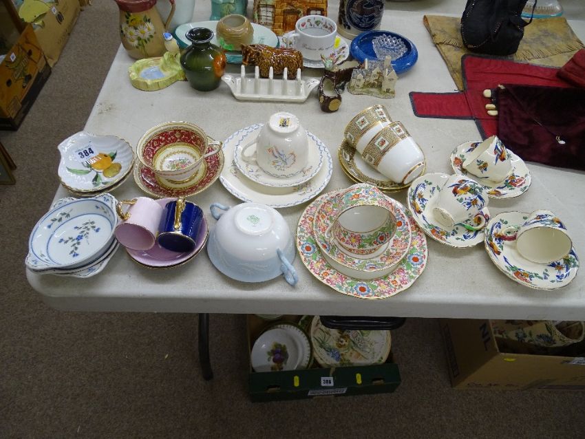 Cabinet cups, saucers and trios by Paragon, Grays Pottery, Hammersley etc, a Shelley china two handled cup and Worcester 'Evesham' and others pin dishes