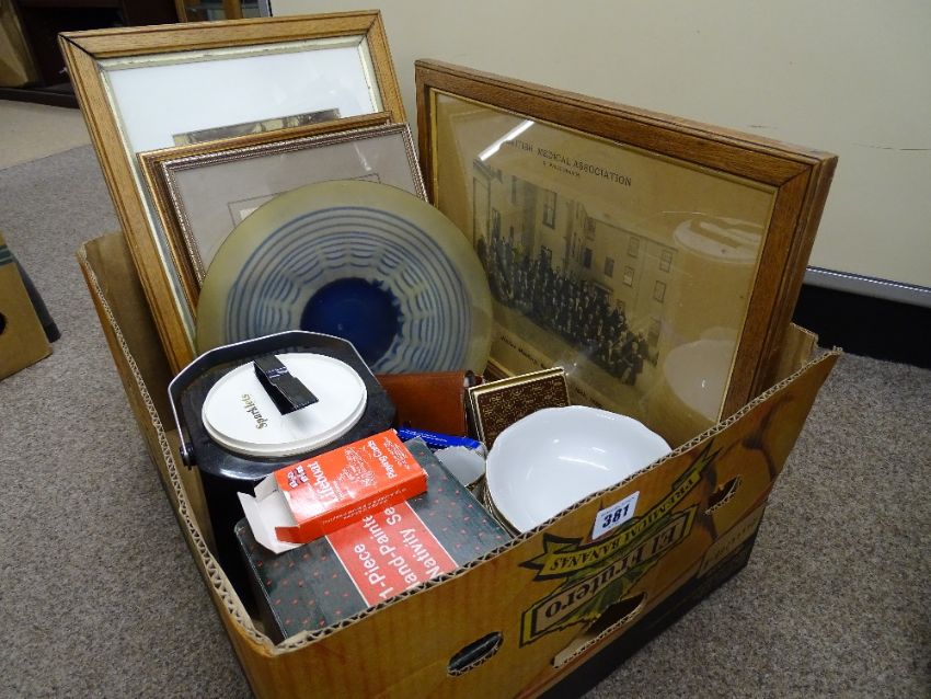 Quantity of framed group photographs, selection of crockery and glassware, playing cards etc