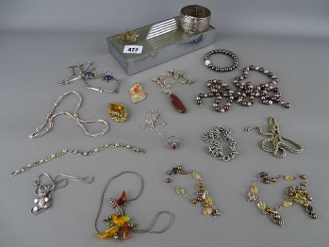 Collection of silver and other jewellery and a white metal chased decorated bangle in an Art Deco chrome and glass topped box