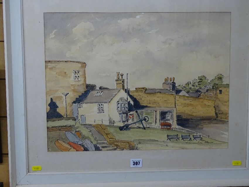 ? FRENCH watercolour and ink - old Conwy Harbour scene, signed, 36 x 48 cms