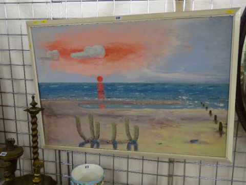 Oil on board - sunset, shore scene, unsigned, 60 x 90 cms