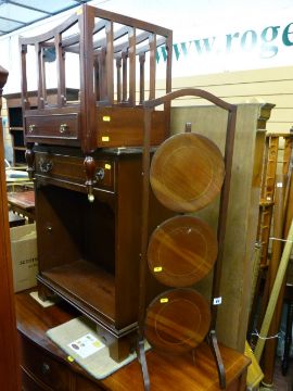 Mahogany three shelf cakestand, a reproduction Canterbury and an inlaid console table