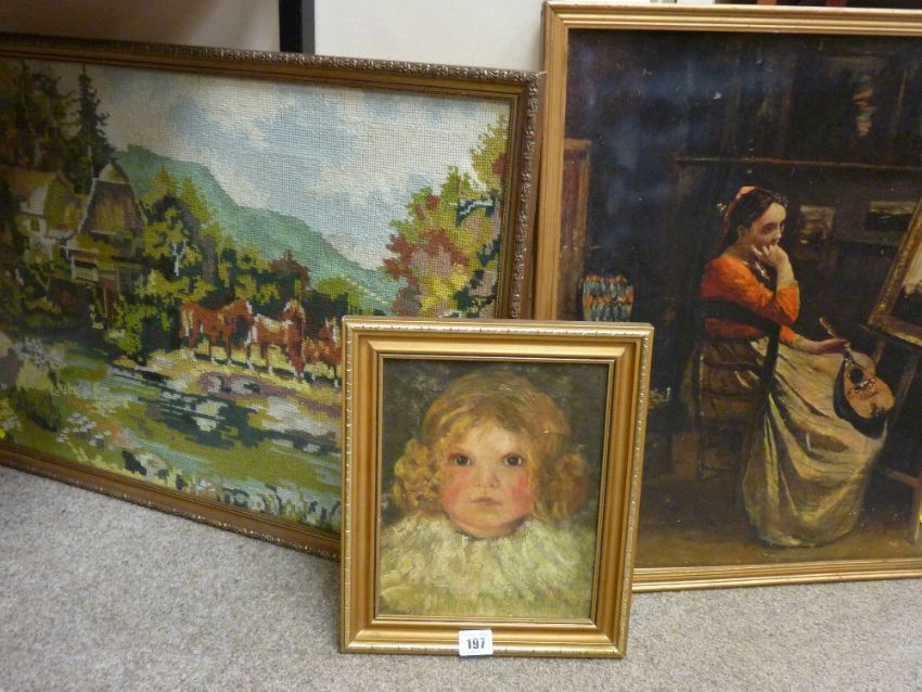 Oil on board - head portrait of a little girl, 24.5 x 20 cms, a framed classical print and a framed tapestry landscape scene