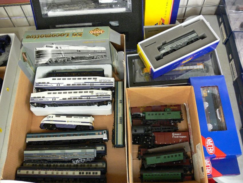 Mixed collection of model railway, engines, carriages and rolling stock including a Union Pacific steam locomotive and tender by Genesis, a New York Central F-3A & B phase II, a Union Pacific SD70A CA no. 8334, Heljan Class 33-1 diesel loco, a 27001 electric in BR lined green, all boxed and apparently unused, a three part US Metrolink by Athearn, H0 scale Baltimore & Ohio E6 loco with various coach cars and a further quantity of rolling stock
