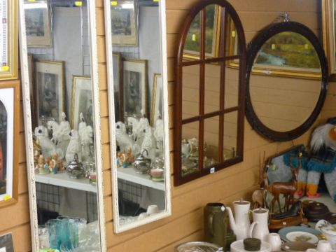 Good oval wooden framed bevelled wall mirror, a sectional wooden framed mirror and two other wall mirrors