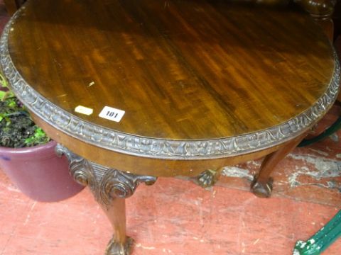 Reproduction mahogany circular side table having carved top detail and knees on ball and claw feet