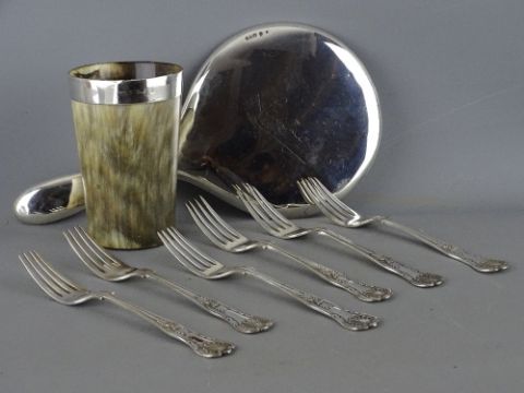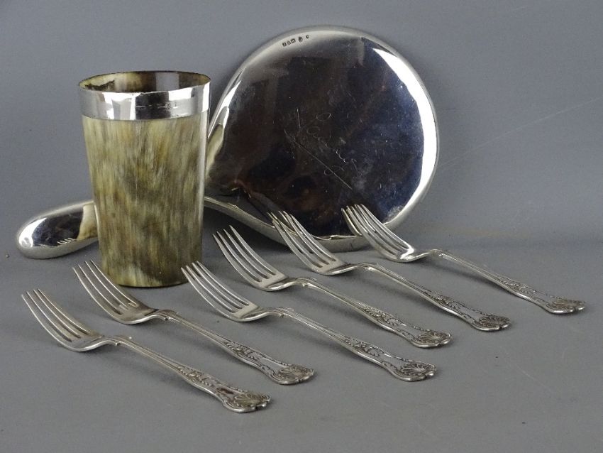 Horn beaker with silver rim, a Chester hallmarked hand mirror and six EPNS King's pattern table forks