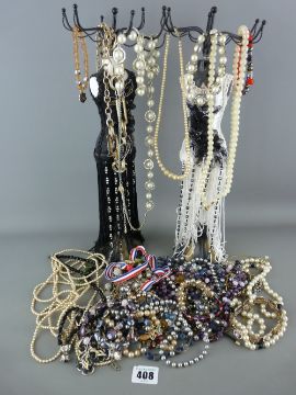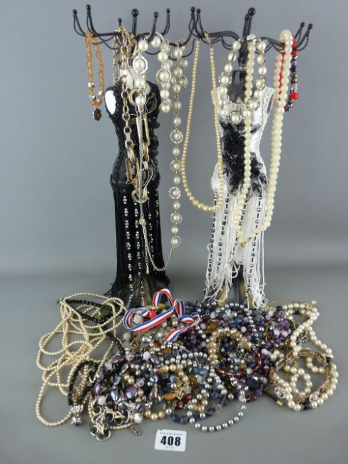 Two mannequin type jewellery stands with a good quantity of costume jewellery necklaces and bracelets