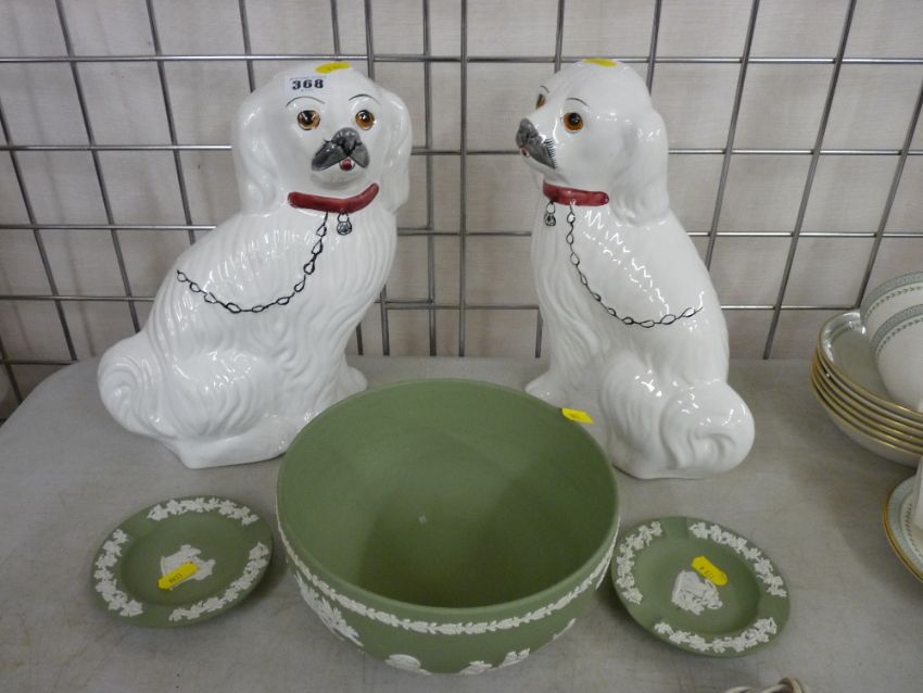 Green Wedgwood Jasperware pedestal bowl, other Wedgwood Jasperware and a pair of Staffs style dogs