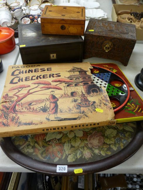 Carved jewellery box, writing slope, small workbox, tapestry tray, boxed pagoda, Chinese chequers tinplate game