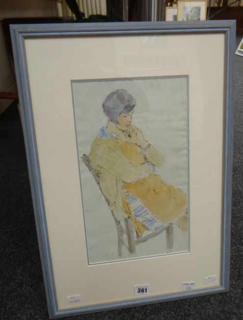 TWENTIETH CENTURY BRITISH SCHOOL pen and watercolour study - contemplating seated figure, 34 x 20cms
