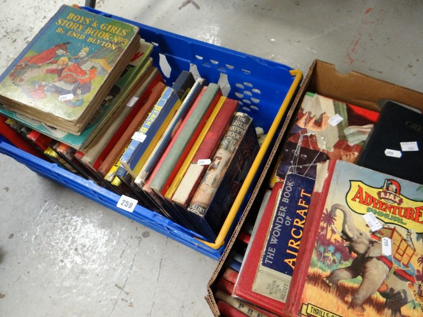Two crates of vintage 1950s and other children's annuals together with multiple volumes of The Book of Knowledge