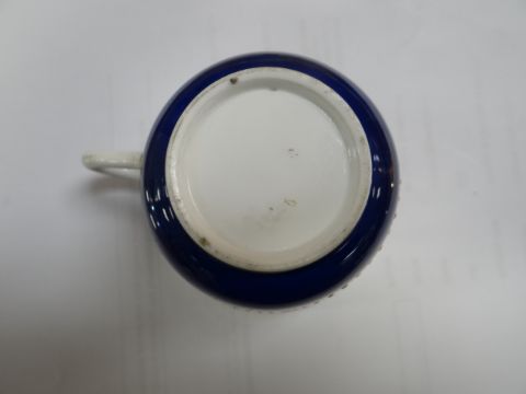 A Minton porcelain deep blue ground porcelain cup and saucer, decorated with panels of poultry and gilding, impressed mark to base; together with a Minton porcelain plate of plain form decorated with a strutting white cockerel, signed J E Dean, 23cms diam and a fluted cup and saucer