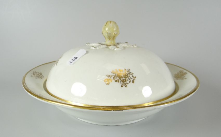 A Swansea porcelain circular based muffin dish and cover with floral gilt decoration and gilded border, the knop fully repaired, Swansea script mark and Sir Leslie Joseph label to the base, 22cms diam