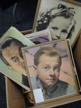 A box of various ephemera including Hollywood and other stars colour portrait pictures including Mickey Rooney, Shirley Temple ETC together with a collection of postcards and other photographic ephemera