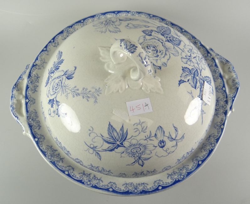 A South Wales pottery blue and white transfer lidded-tureen in the Persian Rose pattern, with twin handles and loop-handle, 33cms diam