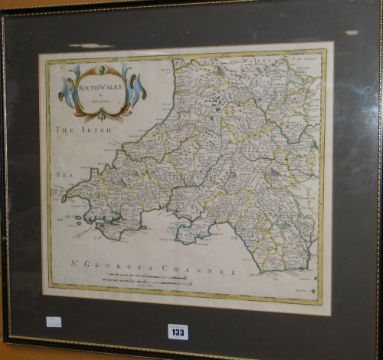 ROBERT MORDEN coloured antiquarian map of South Wales, framed, 38 x 44cms