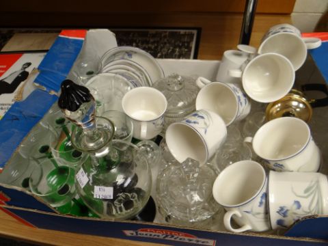 A box of glassware including green stemmed glasses, a black and clear glass liquor set together with Royal Doulton Minerva coffee cups and saucers ETC
