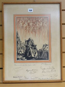 An interesting mid-century framed theatrical print for Hamlet, entitled 'There is a Divinity that shapes our ends...' by Lawrence Irving, the mount of the print signed by Laurence Olivier and fellow thespians including Margaretta Scott, Ann Todd, Maud Tree 'for the King George Pensions Fund 1934', signed by the artist