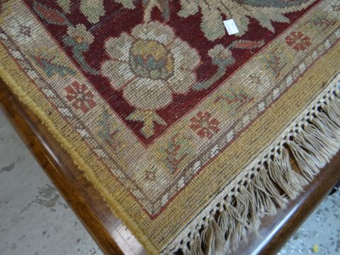 Good quality gold floral and red bordered woollen rug with fringe ends, 244 x 305cms