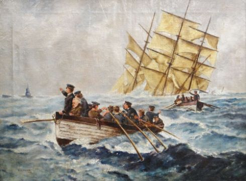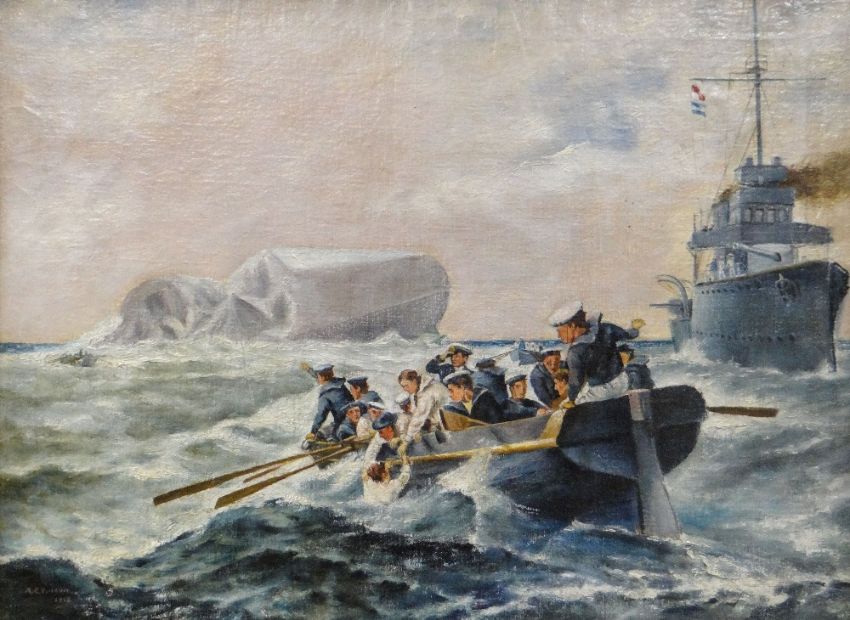 A E VINSON oil on canvas, a pair - naval scenes with British war ship approaching iceberg in and lives being saved on a lifeboat, (2) the other with submarine and sailing ship being lost with two lifeboats, signed and dated 1918, 42 x 59cms (both in matching moulded gilt frames)
