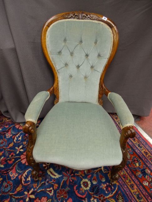 A VICTORIAN WALNUT SPOONBACK ARMCHAIR with carved detail and button back upholstery on brown pot castors, 104 cms high, 67 cms wide, 52 cms seat depth approximately