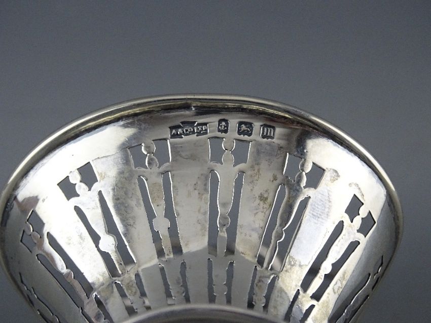 A MINIATURE SILVER SHAPED BASKET on a circular base and with a double intertwined centre handle, maker Asprey, 2 troy ozs, Birmingham 1911