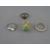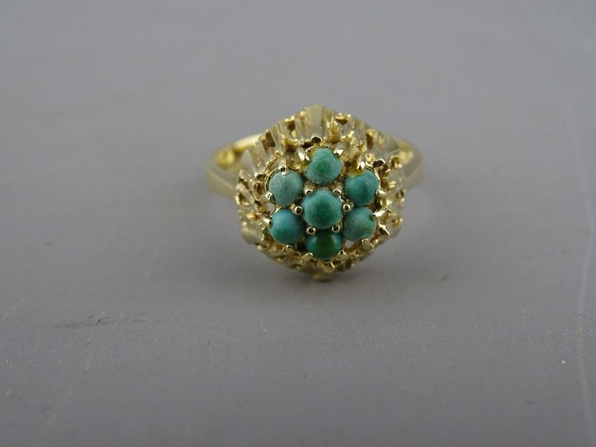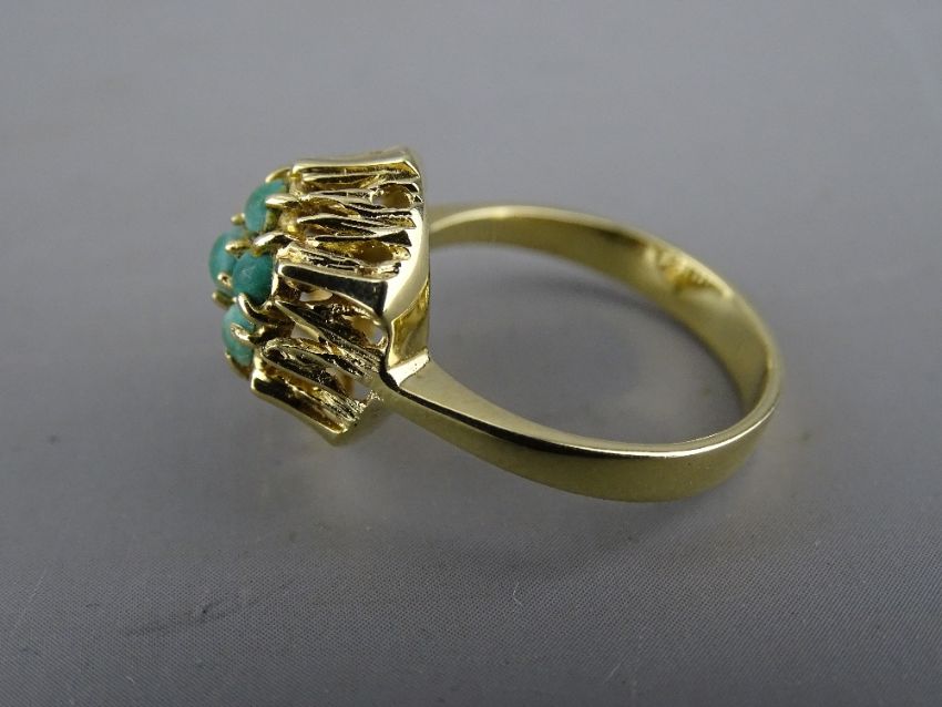 A FOURTEEN CARAT GOLD DRESS RING with centre peridot cluster, 4.5 grms, size M/N and three other non-precious rings