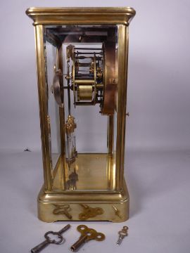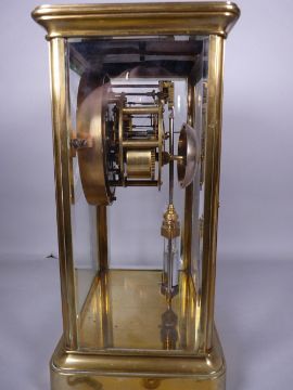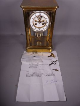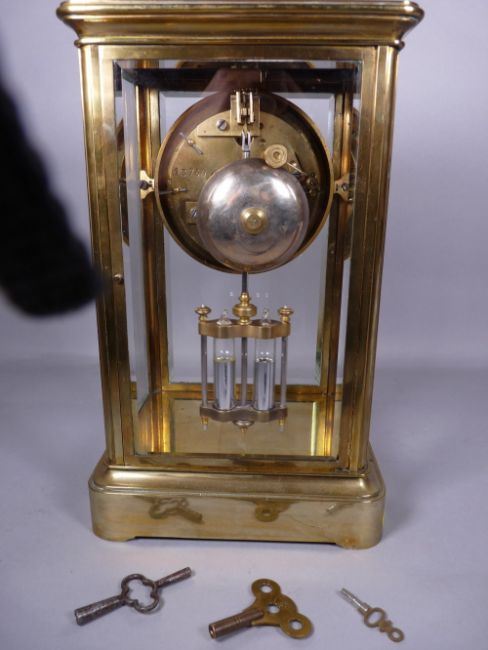 A FRENCH FOUR GLASS, BRASS CASED MANTEL CLOCK, white enamel dial with visible escapement, set with Roman numerals, circular bell strike movement and mercury compensated pendulum, the clock numbered to the back 13750, with key and two others, 27.25 cms high, 17 cms wide, 13 cms deep