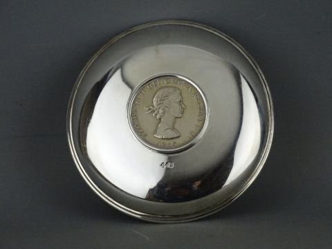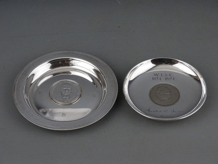 TWO SILVER WINSTON CHURCHILL COMMEMORATIVE DISHES, the centres inset with commemorative coins, London 1974, 11.25 and 12.75 cms diameters, 6.2 troy ozs gross