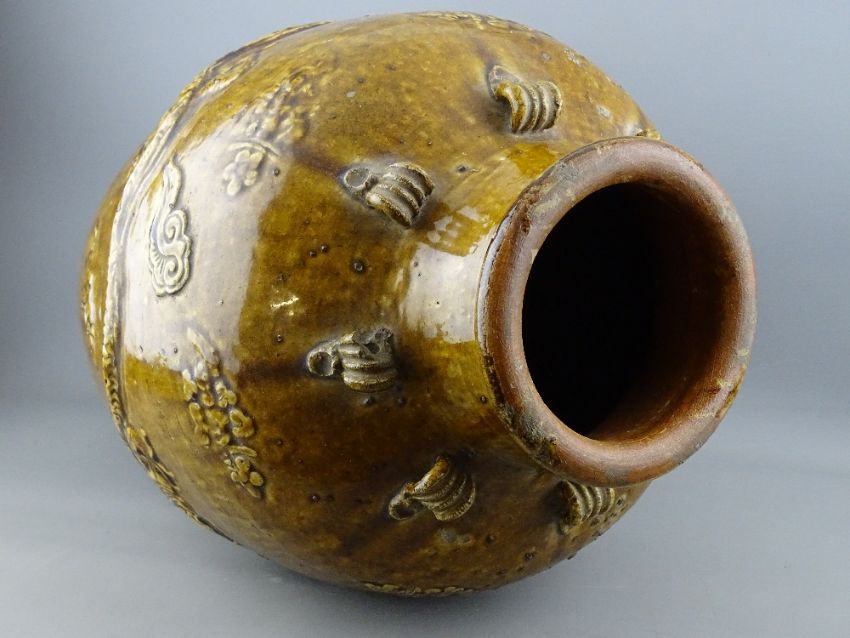 A LARGE MARTABAN BALUSTER SHAPED NARROW NECKED JAR, 60 cms high having raised dragons and eight ribbed and looped handles (damage to one handle, chips to other)