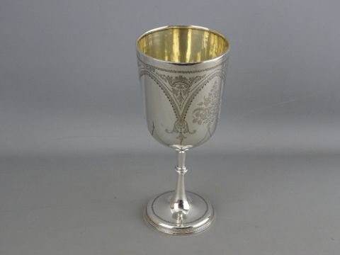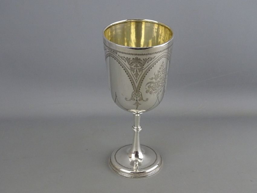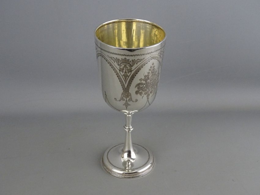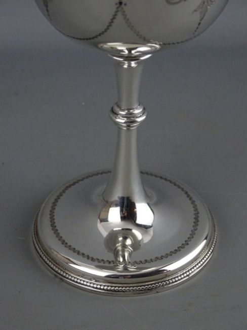 A CIRCULAR BASED BRIGHT CUT SILVER TROPHY CUP, 22.5 cms high, 9.3 troy ozs, London 1895