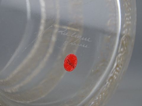 A LALIQUE RICQUEWIHR GLASS BUCKET VASE having three raised bands of flowers and berries, 12 cms diameter, 13 cms high