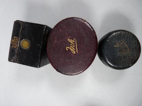 THREE TRAVELLING INKWELLS, a square Berry's Patent, a small circular un-named and an oval with interior copper top finish