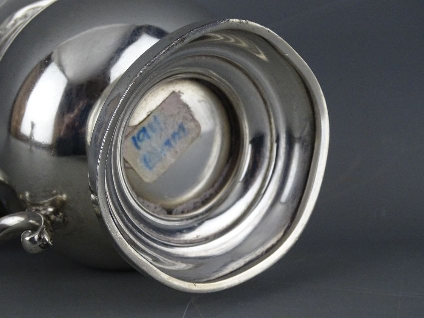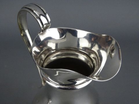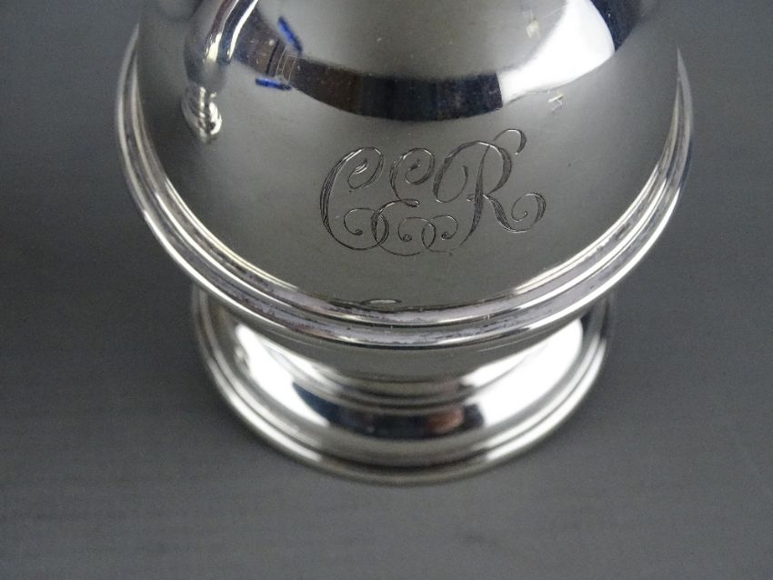 A SILVER NARROW NECKED PLAIN CREAM JUG, monogrammed, 3.8 troy ozs, London 1905 and a circular based squat tankard with scrolled handle (slight impact damage to body), 4.3 troy ozs, Birmingham 1911