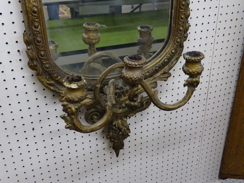 A 19th CENTURY GILT DECORATED GIRANDOLE MIRROR with applied upper and lower floral swags and triple candle sconce, 132 cms high, 41 cms wide maximum (restorations required)