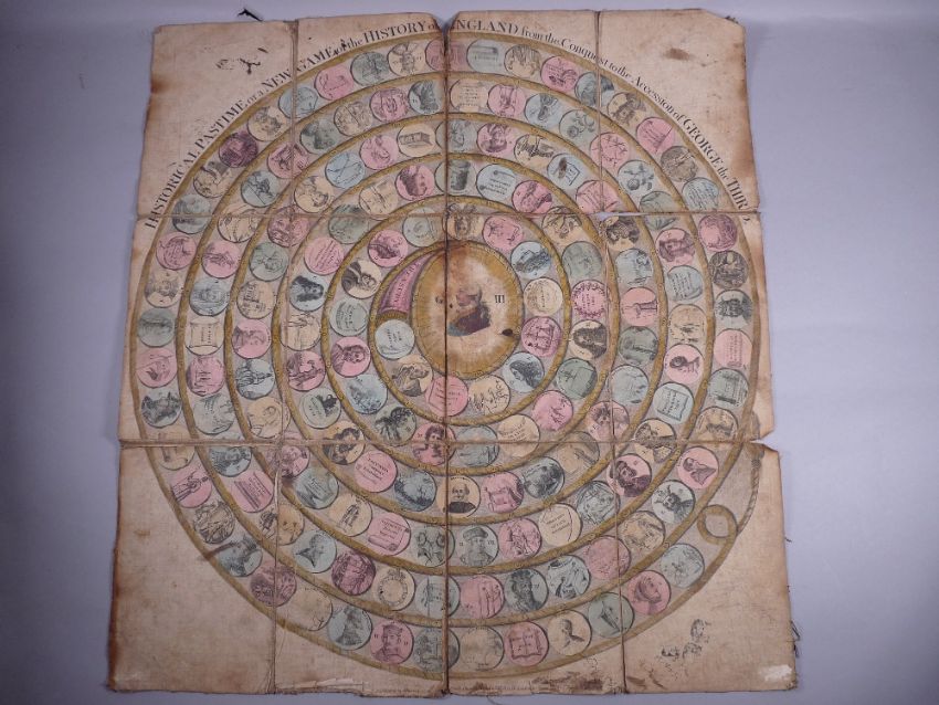 A FOLDING LINEN CHART approximately 52 cms square, entitled 'Historical Pastime or a New Game of the History of England from the Conquest to the Accession of George III' published by J Harris, St Paul's Churchyard, 16 Ludgate Street (folds in delicate condition, please handle carefully)