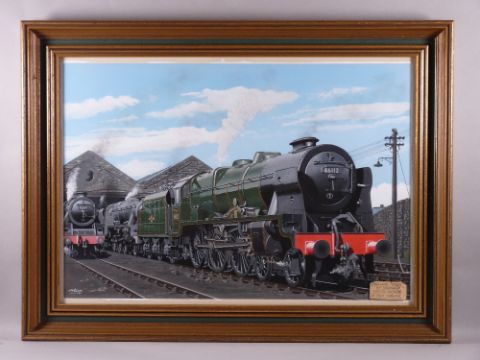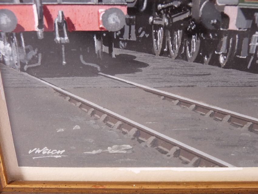 JOHN WELCH fine gouache study - Royal Scot No. 46112 'Sherwood Forest', near sheds at Holyhead with two other engines including 45397 in the background, signed, 34 x 48 cms